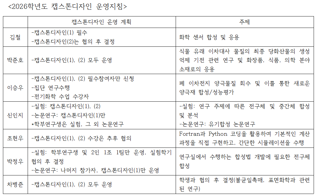 2. 캡스톤디자인 지도교수 신청 - 지도교수 신청 대상 학생 : 7학기가 도래한 재학생부터 수강 가능(2026학년도 1학기에 7학기 이수 예정인 자) - 지도교수 배정 기준 : 학부생 연구원(해당 연구실0순위), 1~7지망 까지 신청하며 인원수를 고려하여 성적순으로 배정한다. - 지도교수 2차 신청기간 : 1차 모집 이후 미배정인 학생들만 2차 모집으로 지도교수 배정 - 배정 발표 : 12월 30일, 학과홈피 알림 (지도교수 배정 후 변경 불가하며 학생 임의 수강신청 불가)
